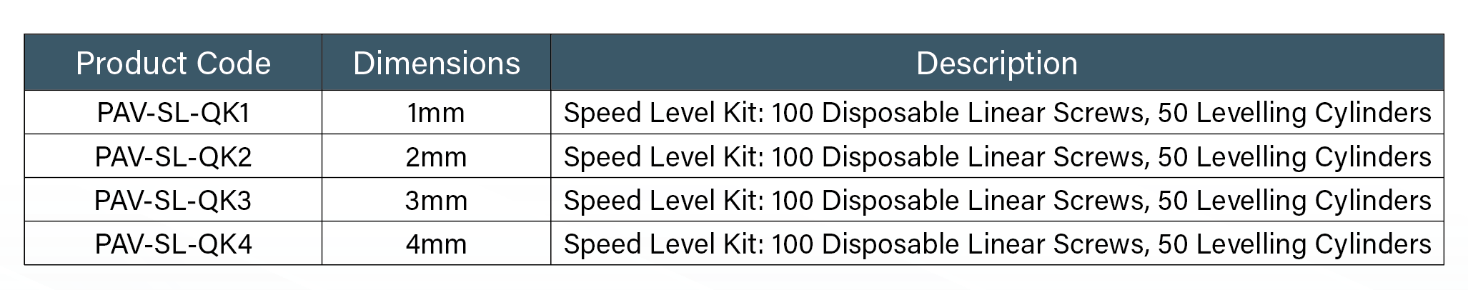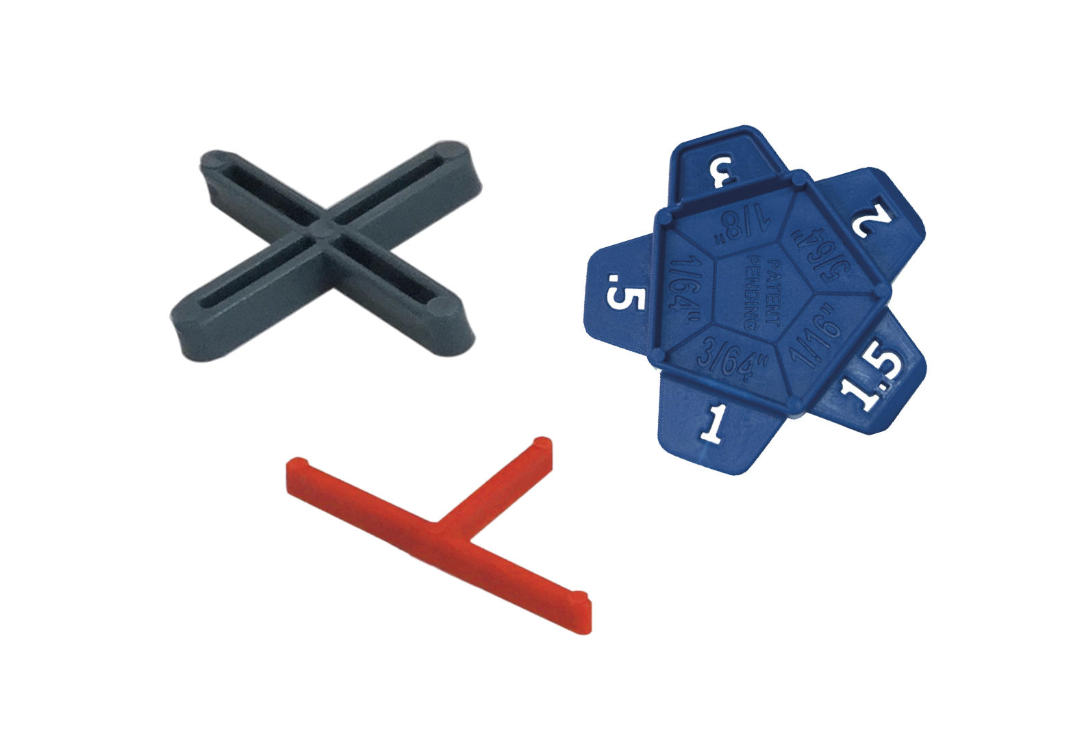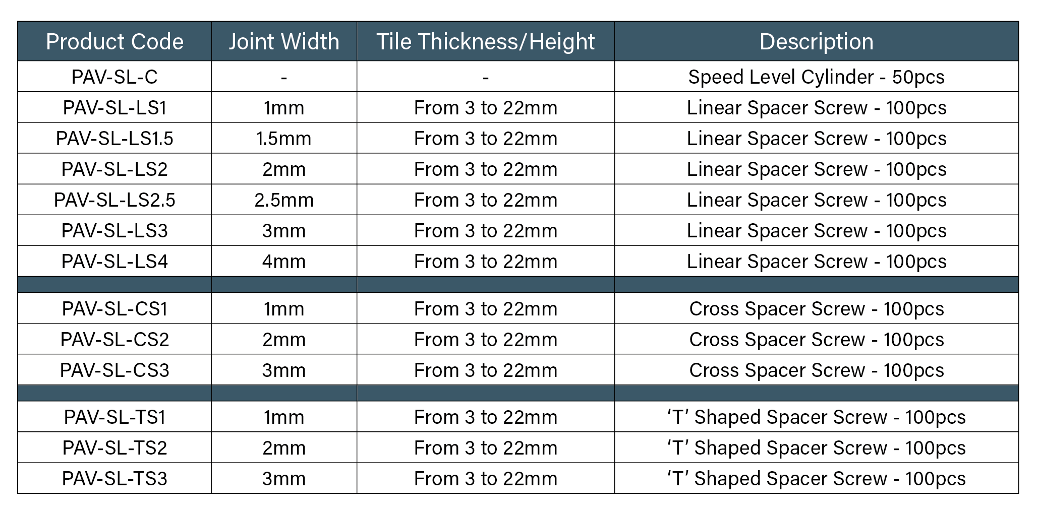 Linear Spacer Screws are available for 1, 1.5, 2, 2.5, 3, 4mm grout joints. Cross and T Spacer Screws are available for 1, 2, 3mm grout joints.